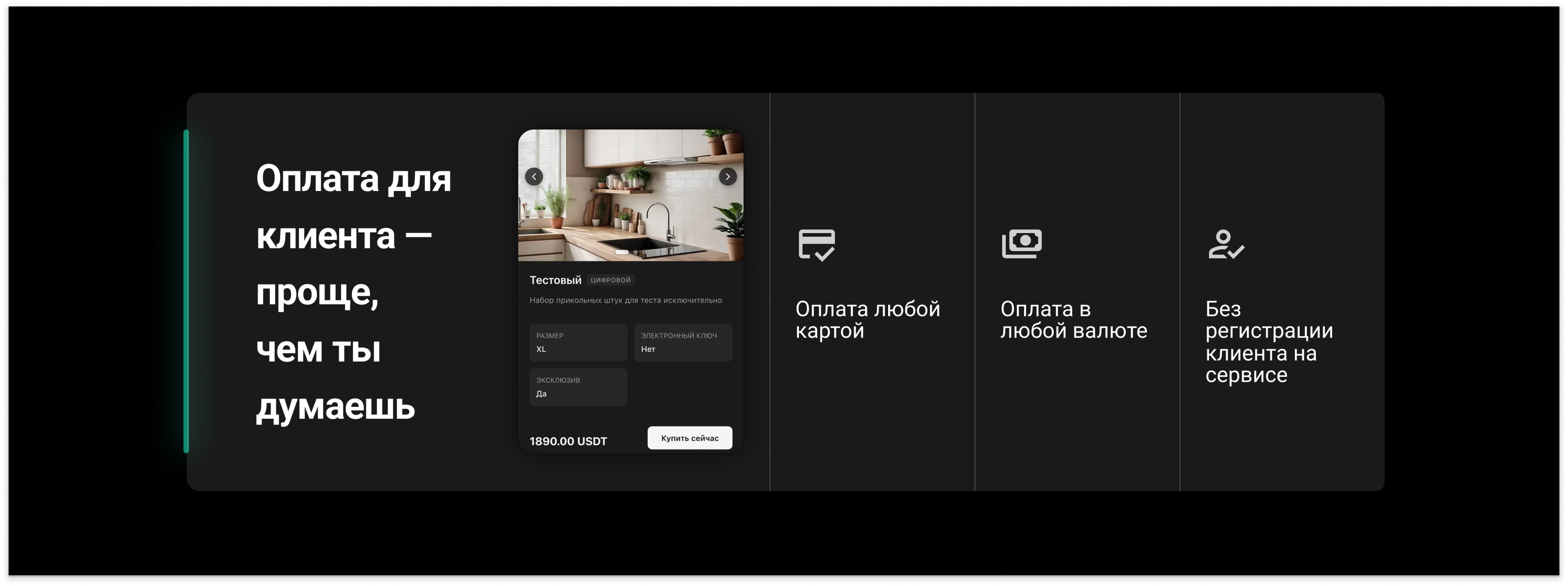 Принимает оплату в криптовалюте, банковских картах и любых валютах.